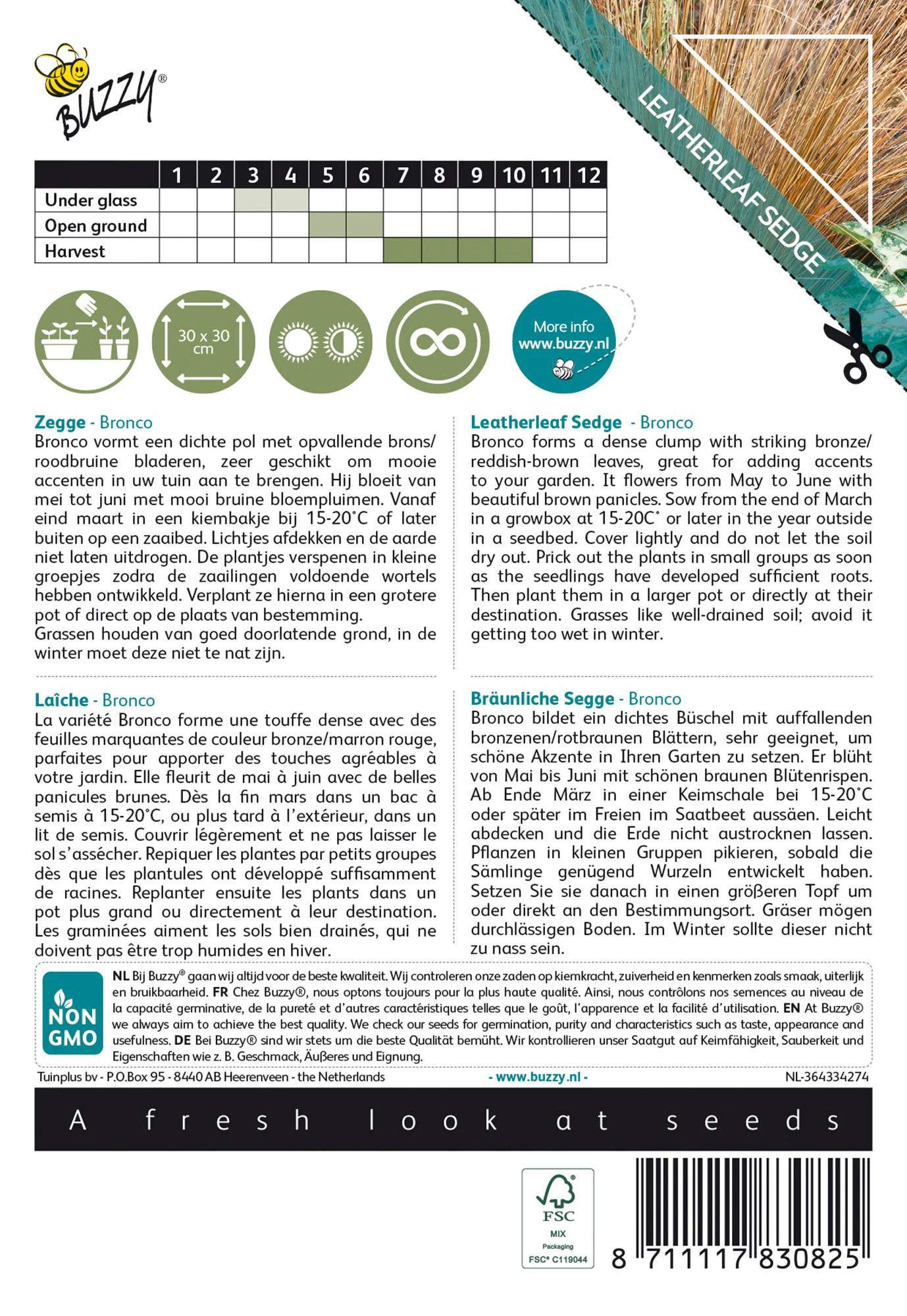 Bronco bildet ein dichtes Büschel mit auffallenden bronzenen/rotbraunen Blättern, sehr geeignet, um schöne Akzente in Ihren Garten zu setzen. Er blüht von Mai bis Juni mit schönen braunen Blütenrispen. Ab Ende März in einer Keimschale bei 15-20°C oder später im Freien im Saatbeet aussäen. Leicht abdecken und die Erde nicht austrocknen lassen. Pflanzen in kleinen Gruppen pikieren, sobald die Sämlinge genügend Wurzeln entwickelt haben. Setzen Sie sie danach in einen größeren Topf um oder direkt an den Bestimmungsort. Gräser mögen durchlässigen Boden. Im Winter sollte dieser nicht zu nass sein.