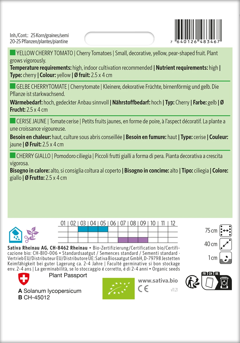 Starkwachsende Sorte mit sehr vielen, kleinsten, gelben Cherrytomaten. Sehr große, verzweigte Fruchtstände.