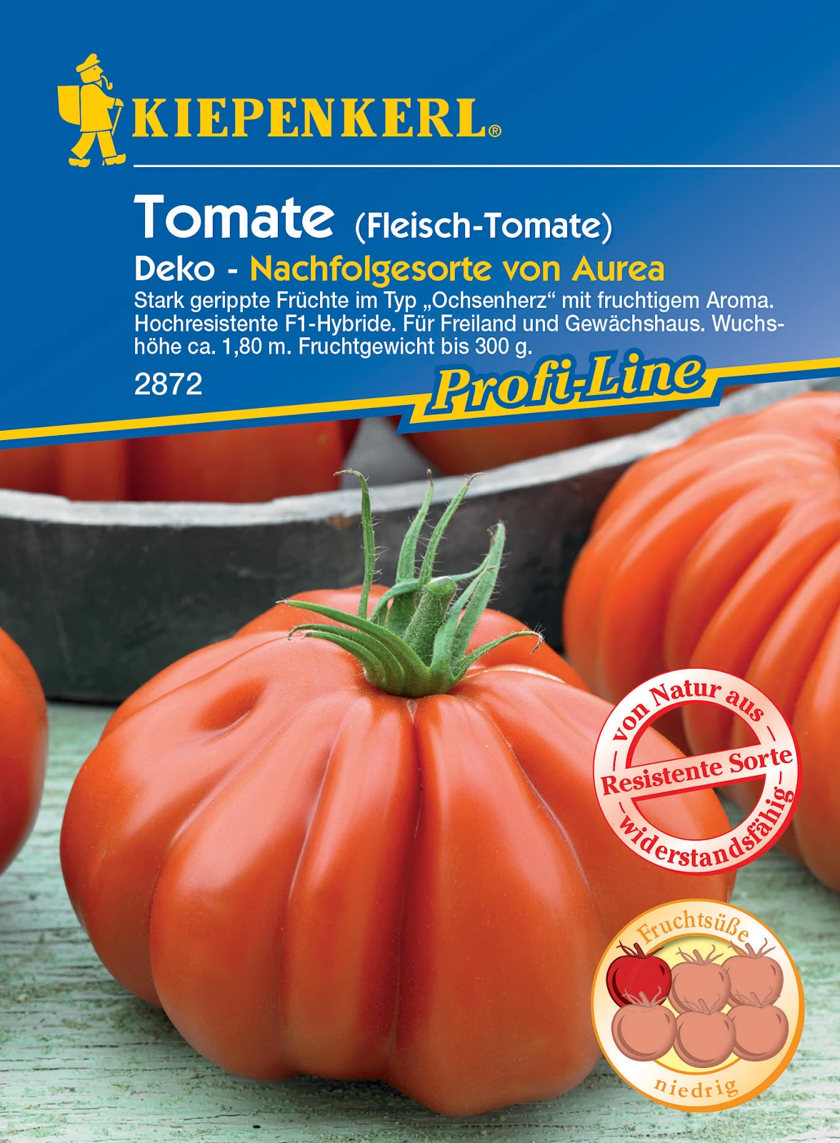 Stark gerippte Früchte im Typ „Ochsenherz“ mit fruchtigem Aroma. Hochresistente F1-Hybride. Für Freiland und Gewächshaus. Wuchshöhe ca. 1,80 m. Fruchtgewicht bis 300 g.
