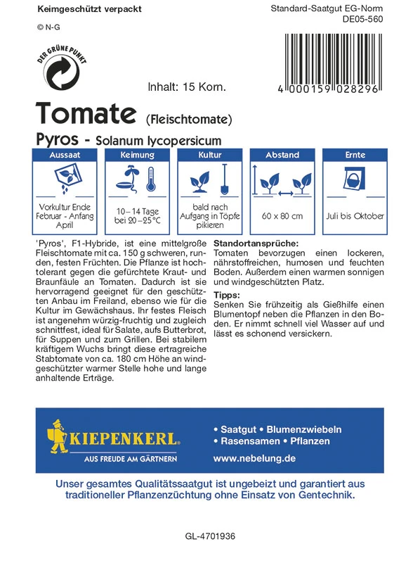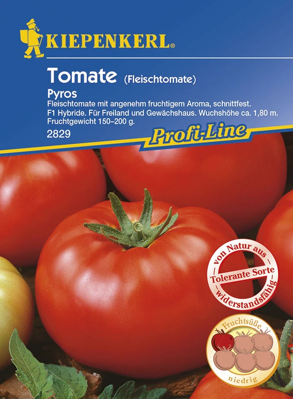 `Pyros`, F1-Hybride, ist eine mittelgroße Fleischtomate mit ca. 150 g schweren, runden, festen Früchten. Die Pflanze ist hochtolerant gegen die gefürchtete Kraut- und Braunfäule an Tomaten. Dadurch ist sie hervorragend geeignet für den geschützten Anbau im Freiland, ebenso wie für die Kultur im Gewächshaus. Ihr festes Fleisch ist angenehm würzig-fruchtig und zugleich Schnittfest, ideal für salate, aufs Butterbrot, für Suppen und zum Grillen. Bei stabilem kräftigem Wuchs bringt diese ertragreiche Stabtomate von ca. 150 – 170 cm Höhe an windgeschützter warmer Stelle hohe und lange anhaltende Erträge.