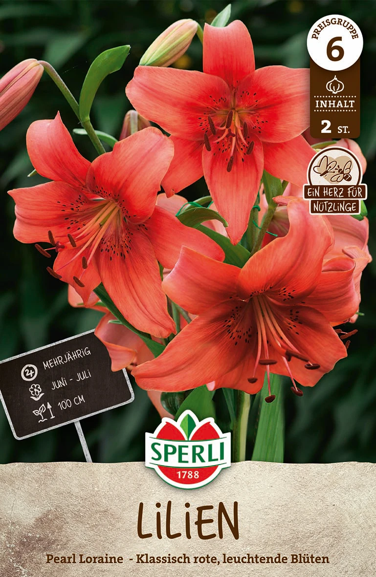 Die Asiatische Lilie ‚Pearl Loraine‘ wird Dich durch ihre vielen Blüten verzaubern. Bei einer Wuchshöhe von 100 cm kommen die spannenden, leuchtend-roten Blüten gut zur Geltung. Diese Sorte ist nicht duftend. ‚Pearl Loraine‘ ist daher auch für alle geeignet, die weniger Freude an süßen, schweren Düften haben. Diese Lilie ist nicht nur in Deinem Garten ein Highlight. Geschnitten gibt sie atemberaubende Sträuße in der Vase ab. Wenn ‚Pearl Loraine‘ im Juni und Juli blüht, zieht sie Insekten an, denn die Blüten enthalten wertvolle Nützlingsnahrung.
