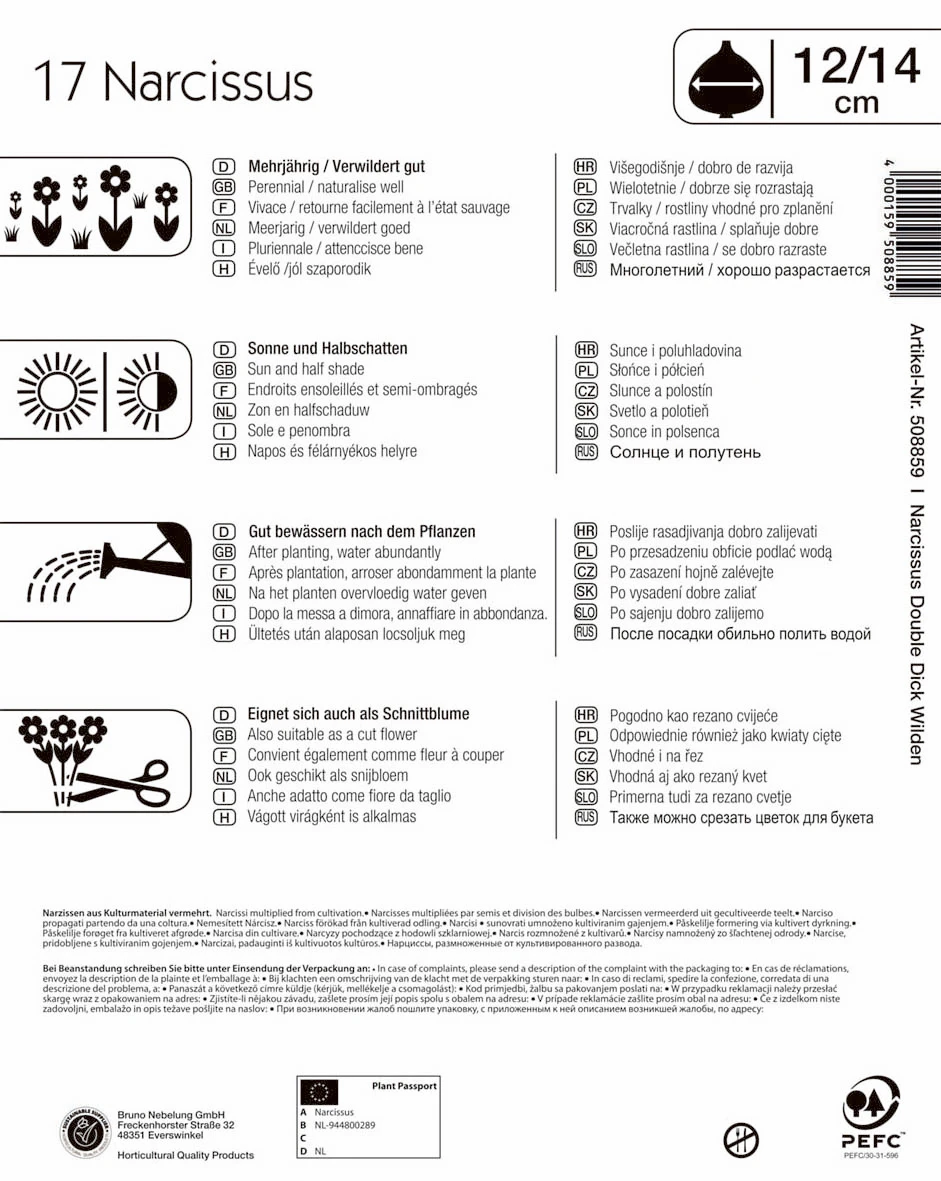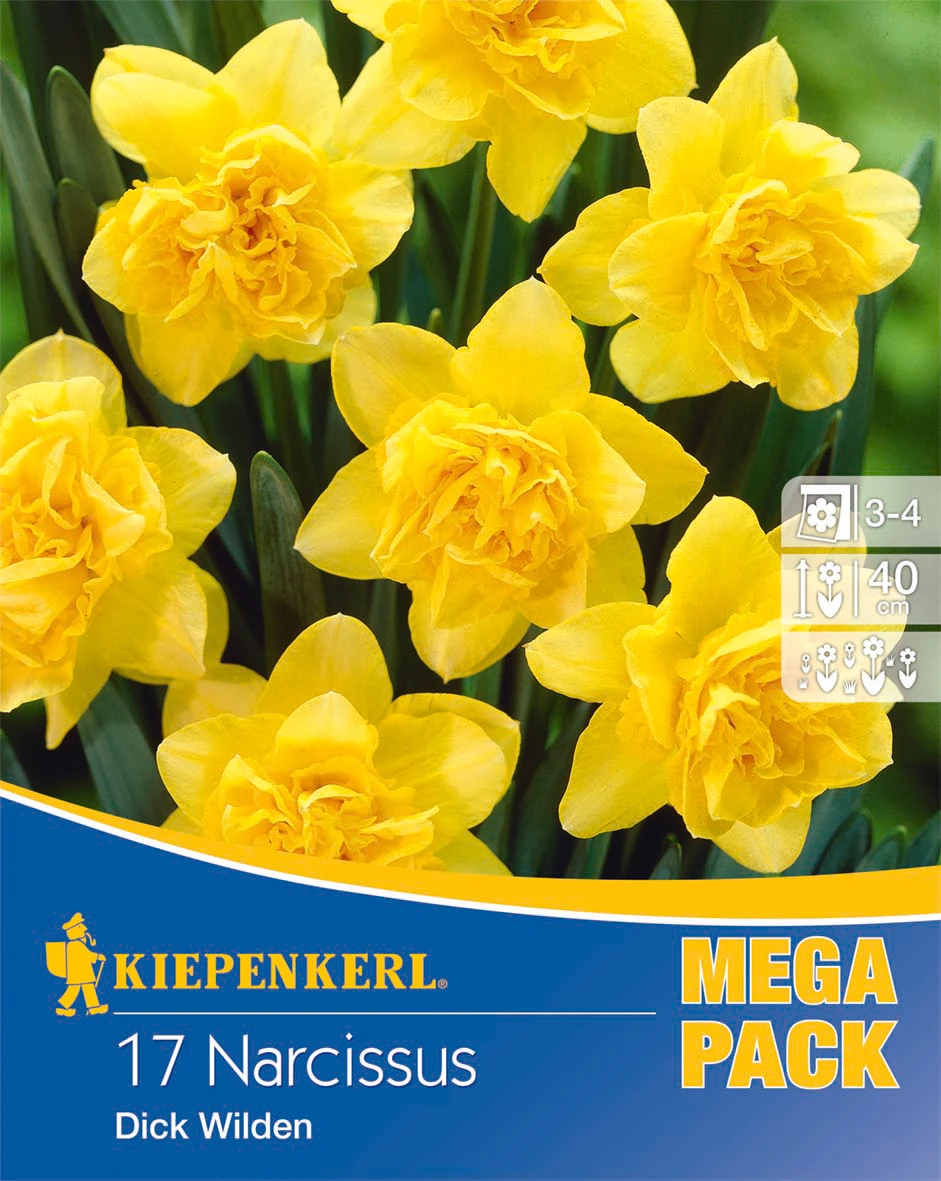 Bei dem Mega-Pack „Narzisse ‚Dick Wilden'“ handelt es sich um eine besondere Narzissensorte, denn diese Blumen sind gefüllt. Sie verschönern dadurch jedes Beet und eignen sich zudem für elegante Frühlingssträuße, denn diese Narzissen können geschnitten werden. Sie erreichen eine Höhe von 40 cm und blühen von März bis April. Optimalerweise werden sie an einem sonnigen bis halbschattigen Ort mit normalem Gartenboden gepflanzt, wo sie auch gut verwildern können.
