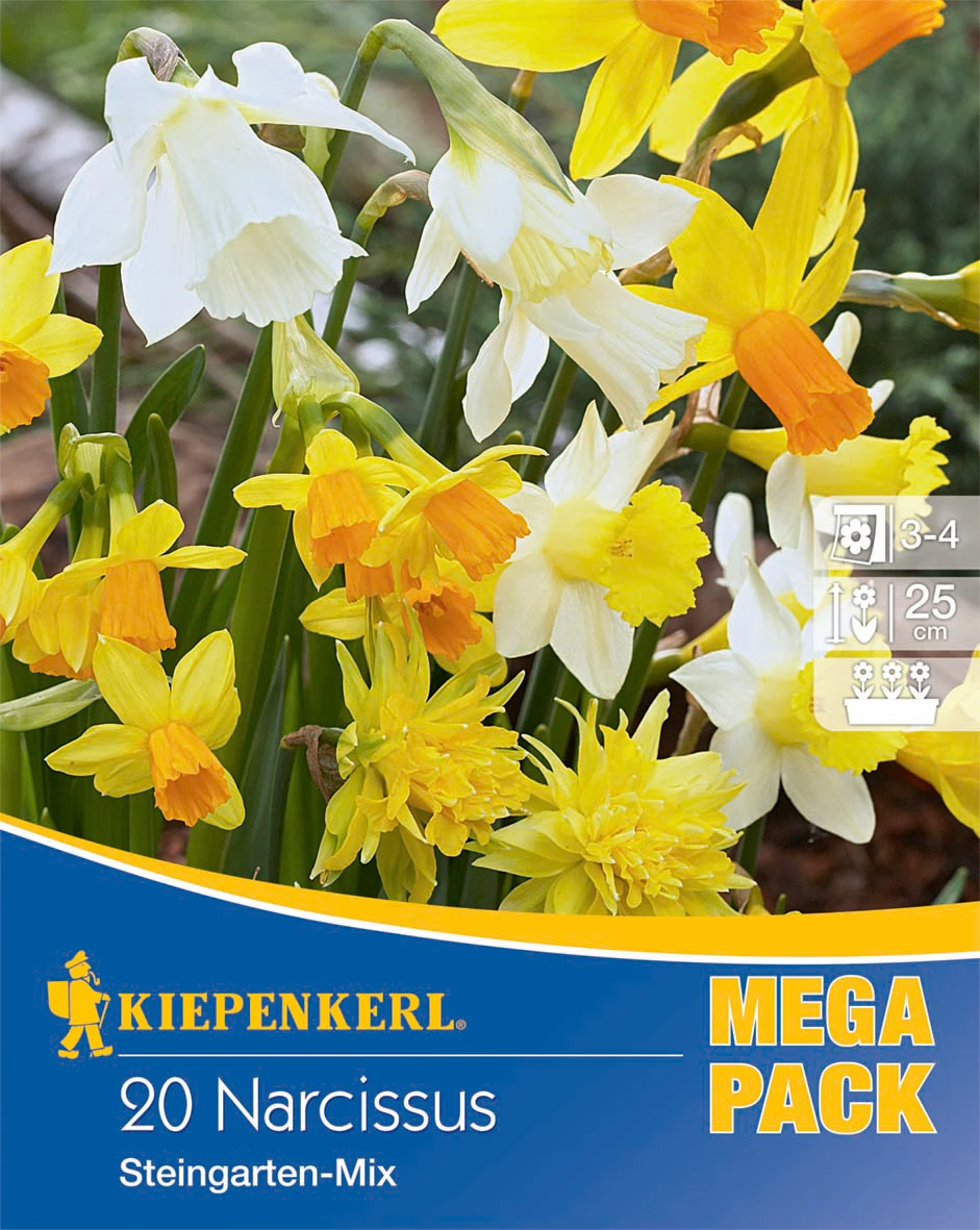 Narzissen können auch auf dem Balkon gepflanzt werden mit dem Mega-Pack „Steingarten Narzissen Mischung“. Die Blumen in dieser Mischung erreichen lediglich eine Wuchshöhe von 25 cm und sind damit bestens für eine Pflanzung in Kübel geeignet. Die Auswahl an verschiedenfarbigen und verschiedenförmigen Narzissen ist perfekt abgestimmt und sorgt für ein schönes Blumenbeet. Die Blütezeit beginnt im März und zieht sich bis in den April hinein. Bei einer Pflanzung im Garten ist es zudem möglich, dass die Narzissen verwildern.