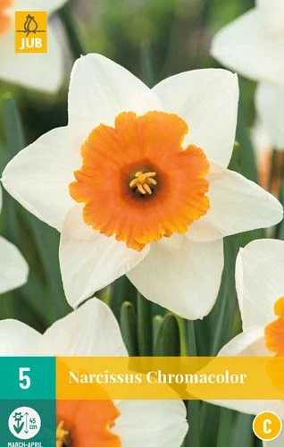 Kräftige Narzisse mit großem Kelch, weißer Blüte und auffallendem orangefarbenem Kelch. Es ist eine gute Narzisse zum Einbürgern. Narzissen Chromacolor sind schön im Beet, aber auch in Töpfen auf der Terrasse oder dem Balkon. Schön mit Hyazinthen zu kombinieren.