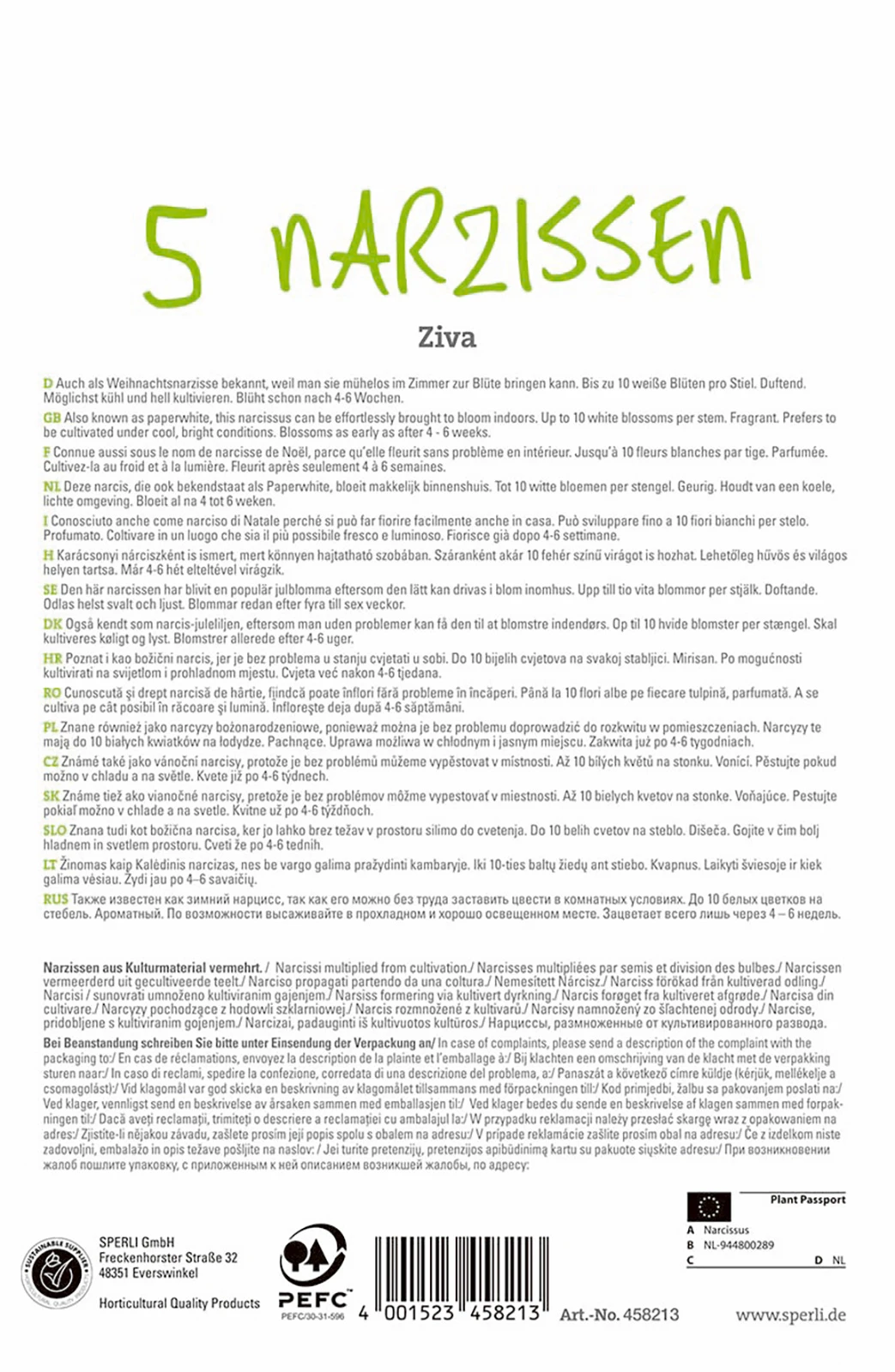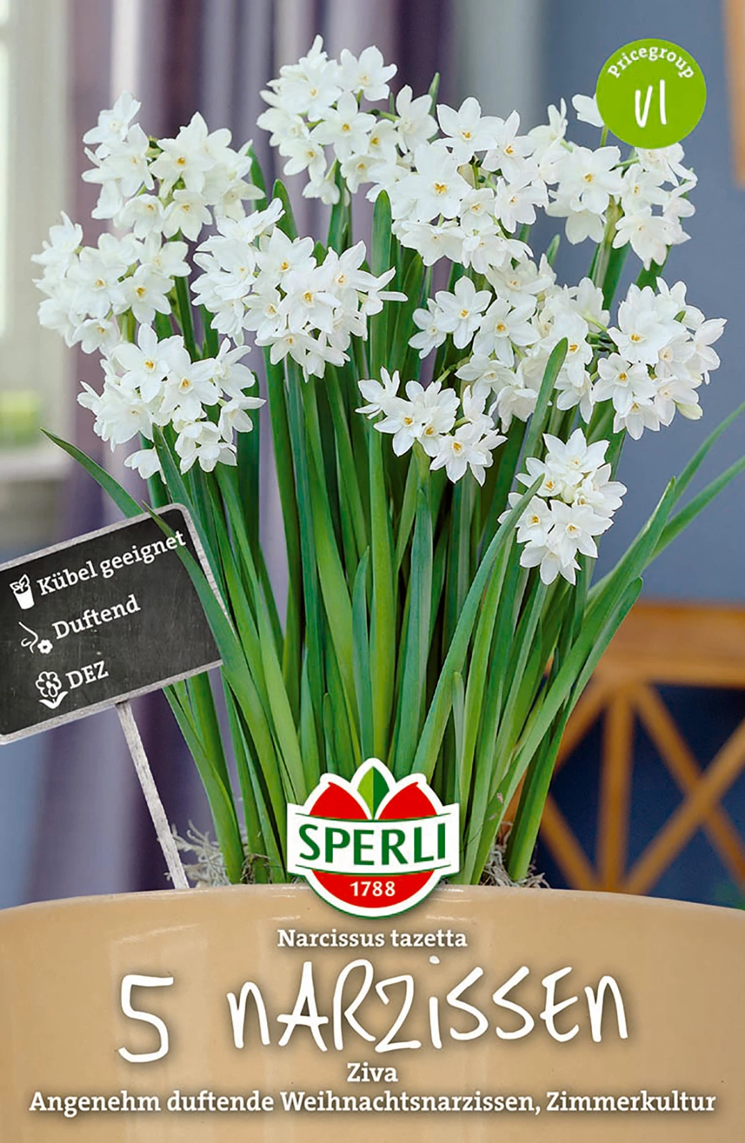 Auch als Weihnachtsnarzisse bekannt, weil man sie mühelos im Zimmer zur Blüte bringen kann. Bis zu 10 weiße Blüten pro Stiel. Duftend. Möglichst kühl und hell kultivieren. Blüht schon nach 4 – 6 Wochen. Diese Narzisse ist nicht frosthart und kann nicht im Garten kultiviert werden.