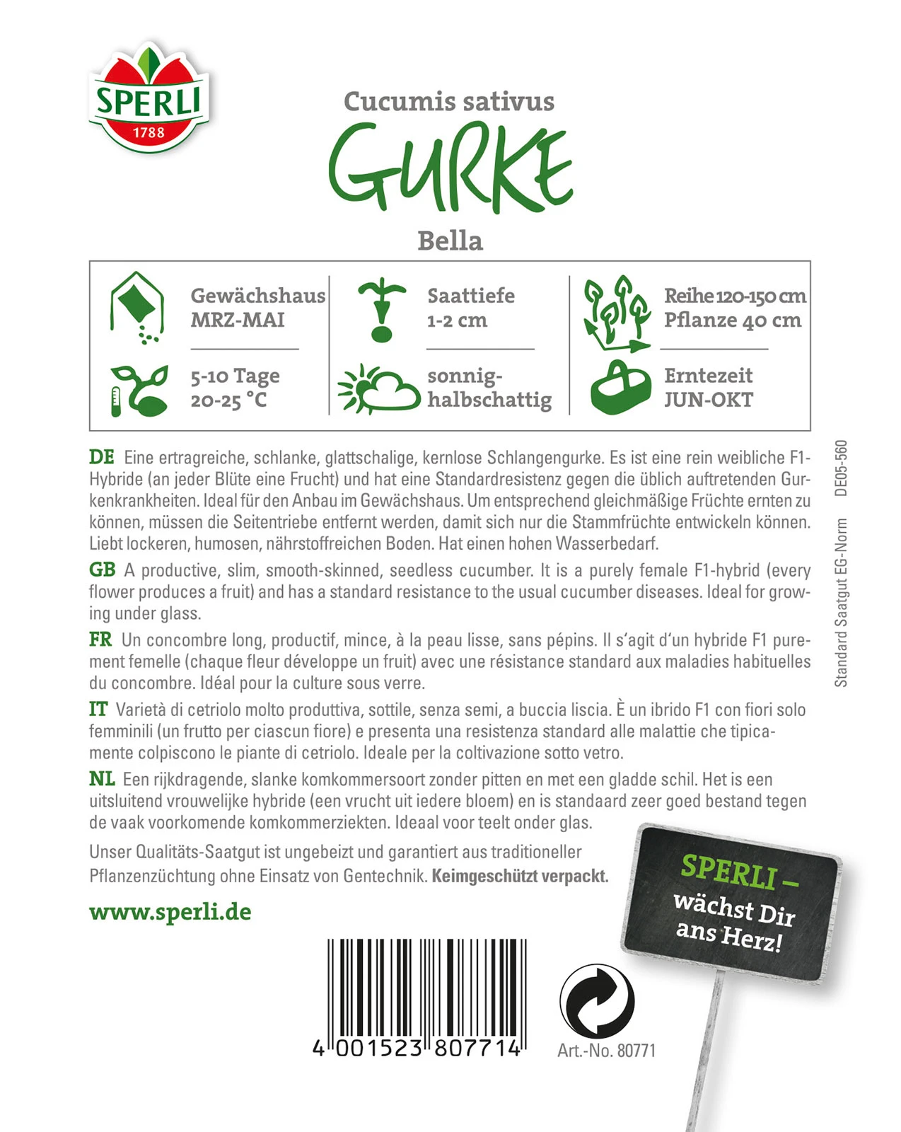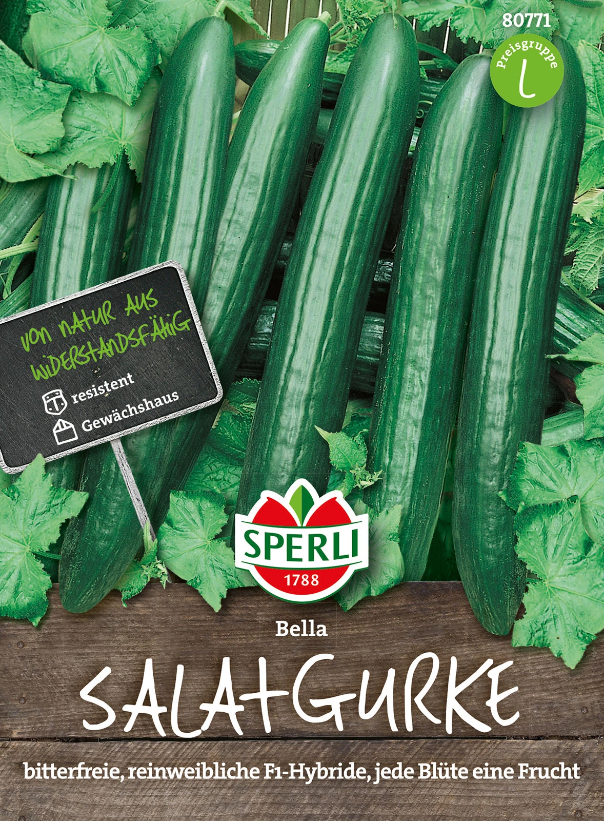 Bella ist eine sehr ertragreiche, bitterfreie, rein weiblich blühende Sorte (jede Blüte eine Frucht!). Ideal für den Anbau unter Glas. Die Salatgurke kann roh als Einzelfrucht oder in verschiedenen Salaten verwendet werden. Diese Sorte hat eine hohe Standardresistenz gegen Gurkenkrätze (Pilzerkrankung) und Blattbrand (Pilzerkrankung), ebenso eine mäßige Toleranz gegen Echten Mehltau (Pilzerkrankung).