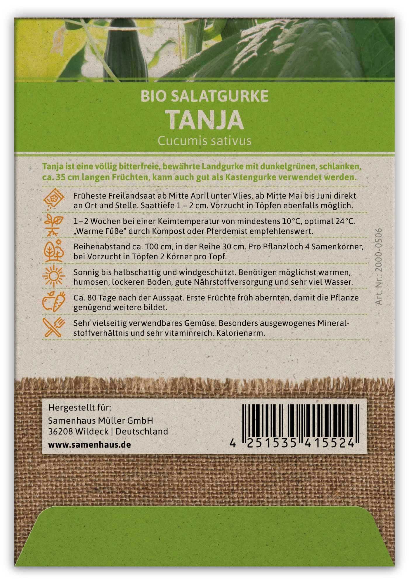 Tanja ist eine völlig bitterfreie, bewährte Landgurke mit dunkelgrünen, schlanken, ca. 35 cm langen Früchten, kann auch gut als Kastengurke verwendet werden.