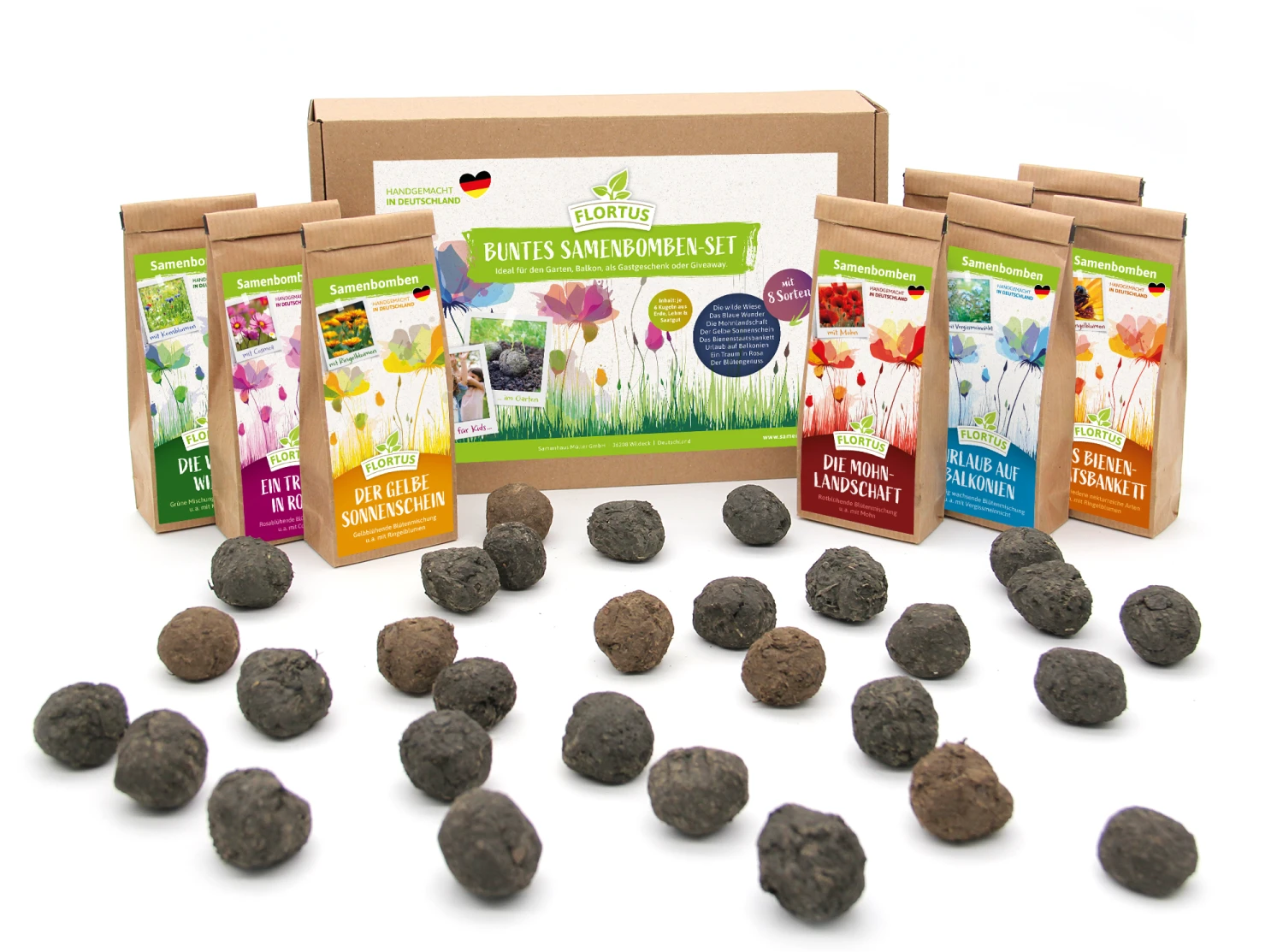 Samenbomben machen die Welt ein wenig bunter. Wussten Sie, dass Samenbomben eine alte Kulturform sind? Die Samenbomben brauchen nur wenig Erde – und diese bringen sie gleich mit. Es braucht lediglich noch etwas Wasser, damit die Seedbombs erblühen. Das wunderbare Set beinhaltet Blumenmischungen in Blau, Gelb, Rosa, Rot und Bunt mit. Sie können um sich herum die Welt kunterbunt gestalten. Und auch Insekten mögen die kleinen Blumenmischungen. Das Samenbombenset ist auch eine tolle Geschenkidee für Kinder und Erwachsene und ein Give-Away, das im Gedächtnis bleibt.