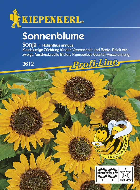 Kleinblumige Züchtung für den Vasenschnitt, für Beete. Reich verzweigt, ausdrucksvolle Blüten. Fleuroselect-Quality-Auszeichnung. Blüht lange. Höhe 100 cm. Einjährig. Wenn Sie von dieser Neuzüchtung langstielige Blüten für die Vase schneiden, werden Sie den Aderlass kaum merken – so reichlich verzweigt sind die Pflanzen von Sonja. Klein und ausdrucksvoll sind die Blüten, mit einem Kranz goldener Zungenblüten und ausdrucksvoller dunkler Mitte. Sie blühen im August und September mehrere Wochen lang. Die bis zu 100 cm hohen Pflanzen sind wirkungsvoll als Hintergrundpflanzung in Rabatten, können aber auch in Töpfen und speziell als Schnittblumen in Reihen ausgesät werden. Mit sonnigem Gelb zaubern sie Freundlichkeit und gute Laune herbei – selbst an trüben Tagen.