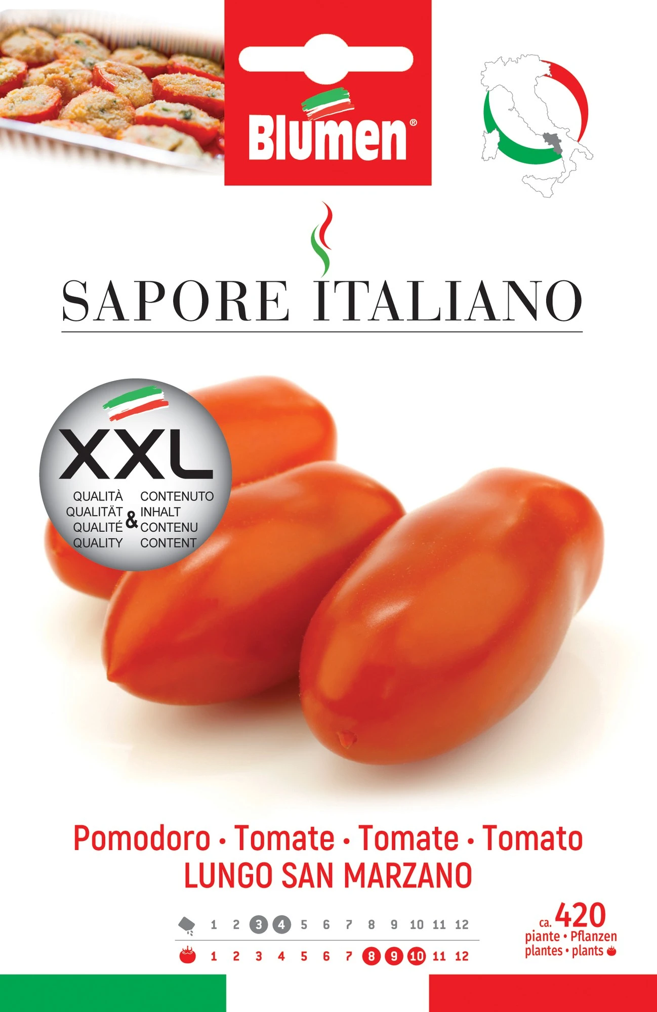 Echte San Marzano Tomate mit unbegrenzt wachsender Pflanze und kräftiger Wuchshöhe. Die länglichen Buschtomaten (bis zu 10 cm) haben einen Durchmesser von 4-5 cm. Die Früchte wiegen 90-100 g.