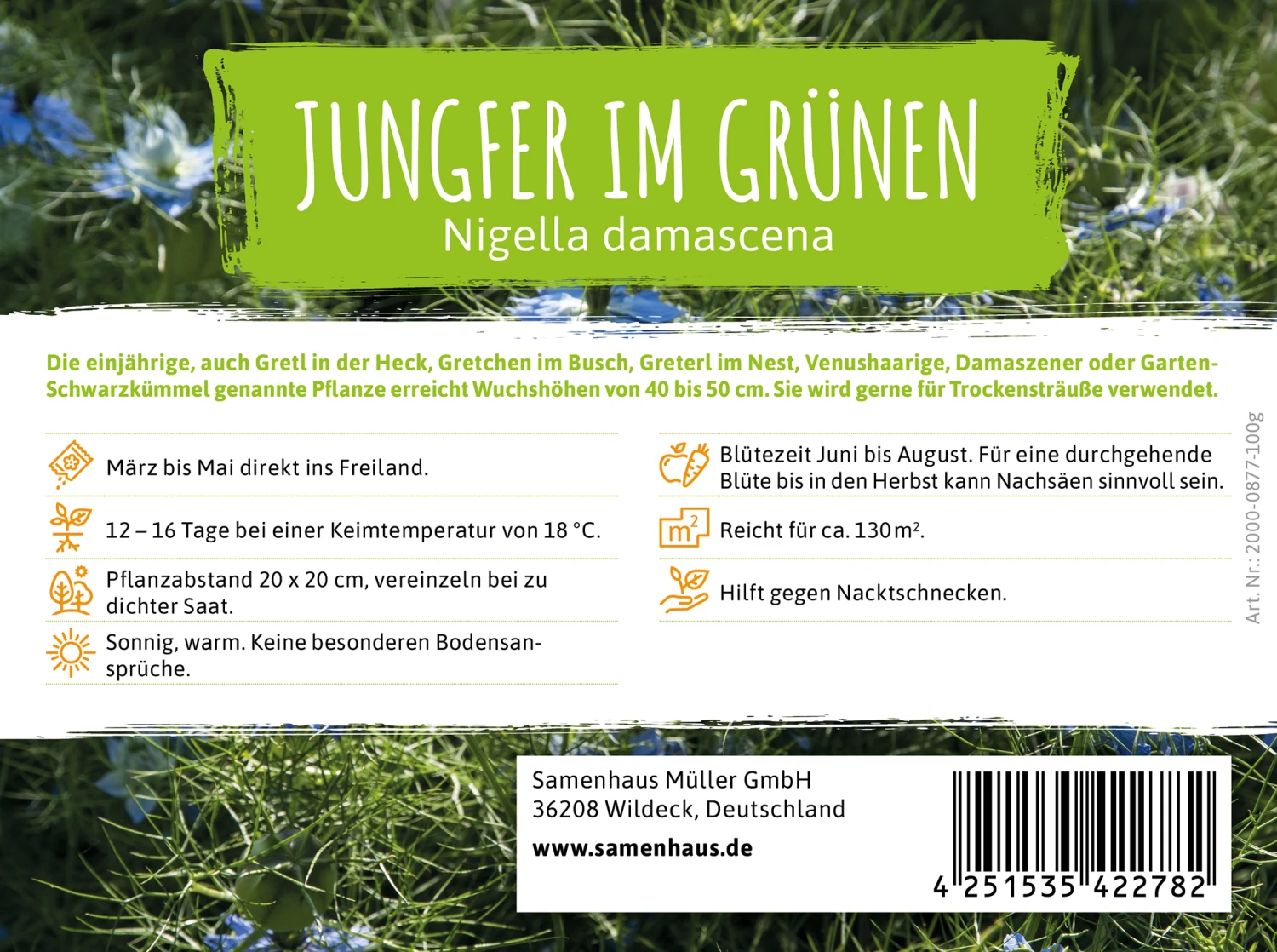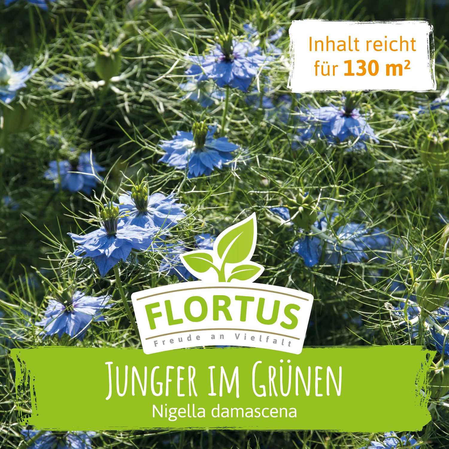 Die Jungfer im Grünen fasziniert durch ihre feinen, bizarren Blüten, die in einem wunderbaren Himmelsblau, Rosa oder Weiß erstrahlen. Die Blumen sind eine wichtige Nahrungsquelle für Insekten. Über den ganzen Sommer locken die Blüten Bienen, Hummeln, Schmetterlinge und viele andere Insekten an. Ihre Samen sind essbar und schmecken fein gemahlen nach Waldmeister. Sie können die Samen für süße Speisen verwenden. Die pflegeleichten Sommerblumen eignen sich wunderbar für Wiesen, Feldränder und viele andere Standorte. Die Blumen sind anspruchslos und gedeihen fast überall, solange der Standort sonnig ist. Getrocknet können Sie die Jungfer im Grünen in Trockensträußen verwenden.